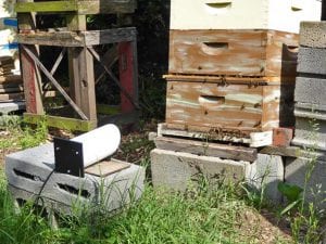 Hive weight provides one of the most useful kinds of data one can have about one’s colonies. When a colony starts putting on weight, the nectar flow has begun and one should add supers. When the colony stops putting on weight the nectar flow is over and it is time to harvest. The rate of increase tells you how productive a colony is, compared to other colonies and how this year’s nectar flow, or this crop compares to other years’ flow or other crops. When hive weight is falling, you know how rapidly the colony is consuming its stores, whether you will need to feed, and when. At finer levels of detail, a hive scale can tell you when the foragers depart in the morning, when they return in the evening, and the amounts of water evaporated overnight from the day’s nectar harvest. Hive weight will also indicate orientation flights, swarming, absconding, usurping, robbing, and being robbed. Many electronic colony monitoring vendors (and DIYers) offer electronic hive scales. One major difference among these vendors is the number of load cells in the product, which may be one, two, or four. Any of these arrangements will work. The products built around a single load cell typically have a sturdy frame to support the hive on the load cell, which is centered under the hive. A box holding the battery, electronics, and communications is near the load cell, under the hive. Products build around two load cells typically support one end of the hive on a bar holding the two cells, battery, and etc., while the other end of the hive rests on a user-provided fulcrum. Hive weight is assumed to be double the scale reading. Both the quality of the fulcrum and the distribution of material within the hive can affect how the reading differs from the actual weight. For example, a Boardman feeder, if it placed directly over the fulcrum, will not affect the reported weight as it is filled and emptied. Products using four load cells typically place one load cell at each corner of the hive. In principle, this leads to a more-accurate weight. All hive scales must be placed on a hard, flat (not warped), surface. Scales placed on a soft or warped surface will not report weight accurately.
