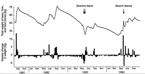 Figure 2.14, Three-year record of weekly weighings of a honey bee colony… The colony gained weight… for just a few weeks each summer and then gradually lost approximately 25 kg of weight over the winter period, October to May. T. D. Seeley. (1995) The Wisdom of the Hive. Page 44.